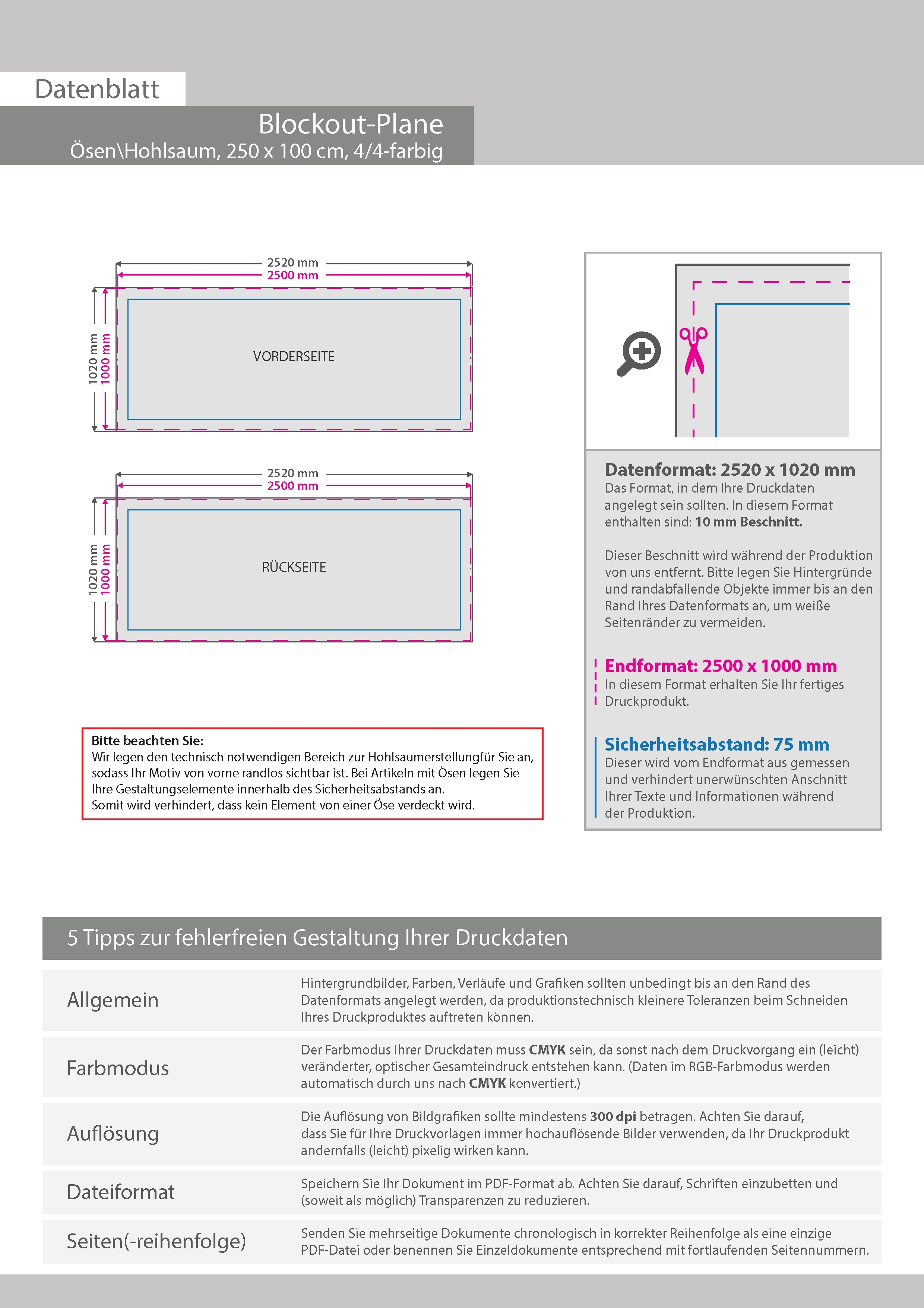 Hochwertige Blockout-Plane 250 x 100 cm, 4/4-farbig bedruckt, Ösen im Abstand von 50 cm links und rechts