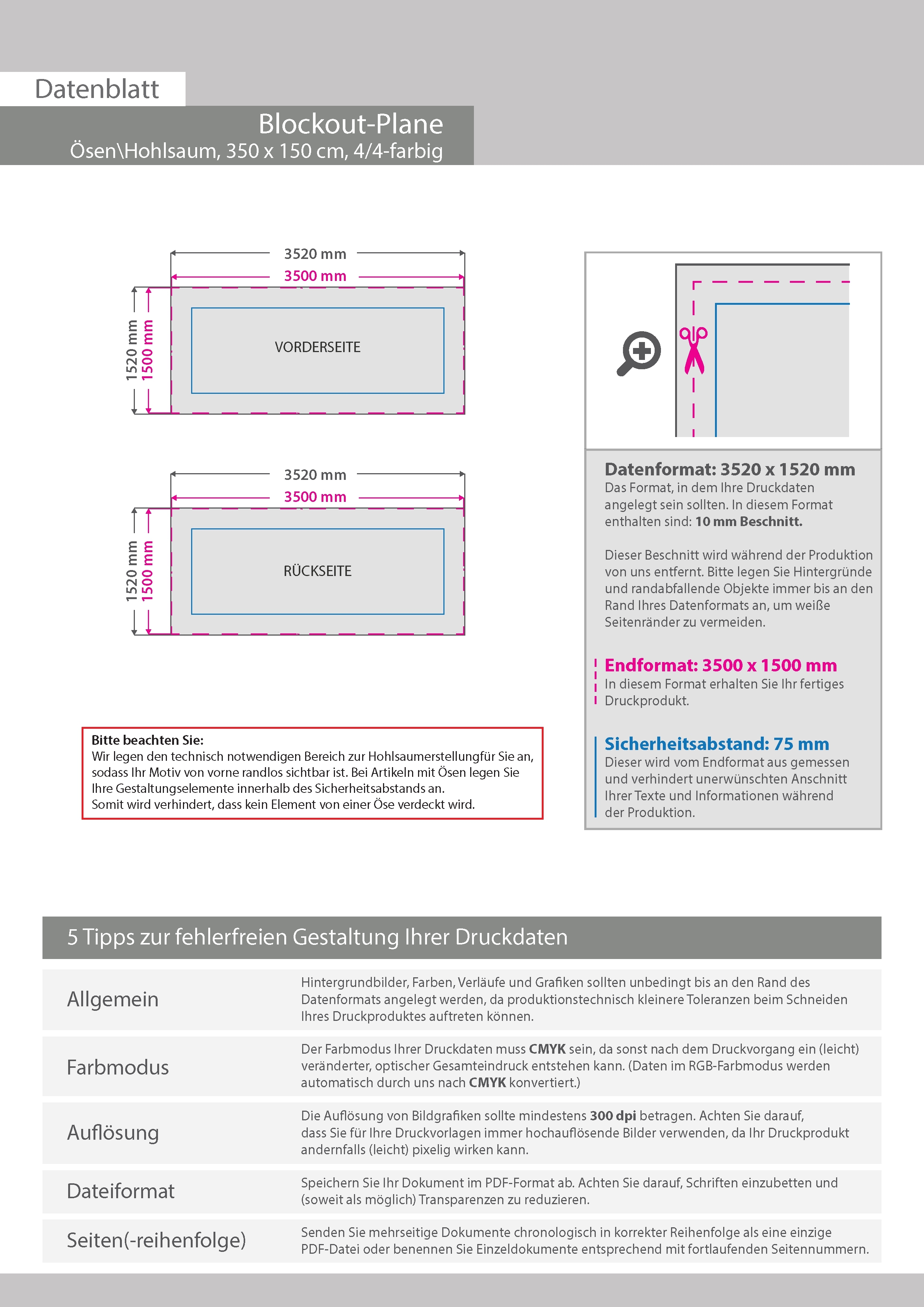 Hochwertige Blockout-Plane 350 x 150 cm, 4/4-farbig bedruckt, Hohlsaum oben und unten (Durchmesser Hohlsaum 3,0 cm)