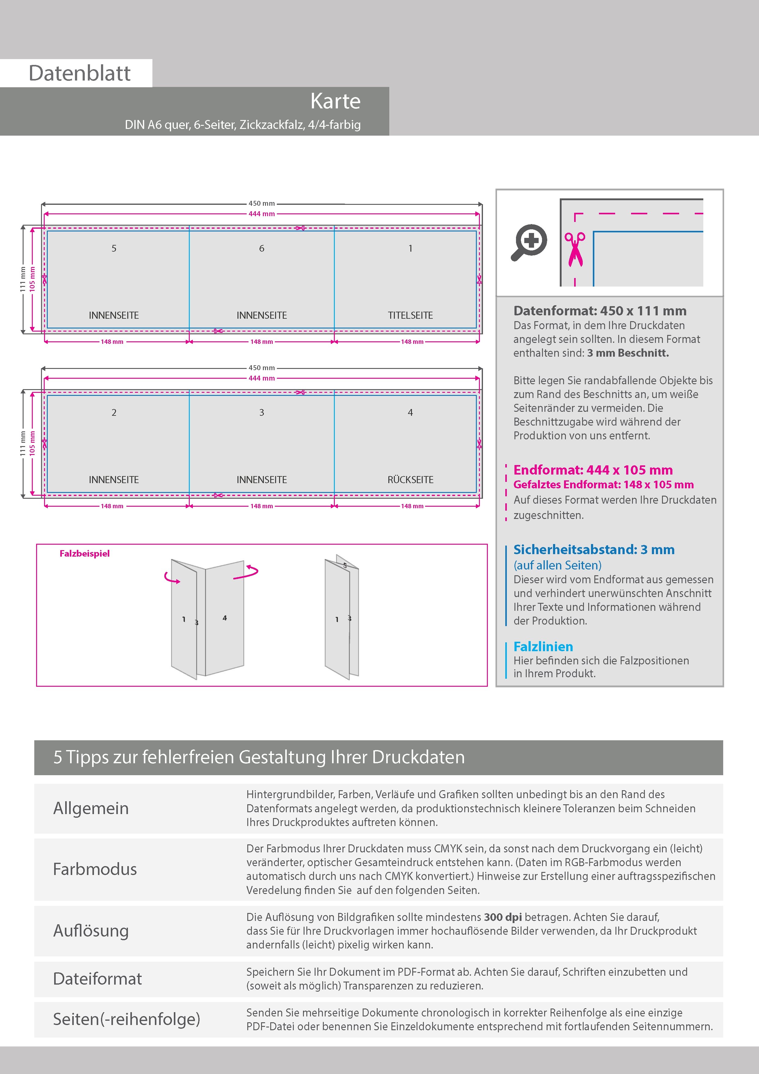 Einladungskarte, gefalzt auf DIN A6 quer, vertikaler Zickzackfalz, 6-seitig