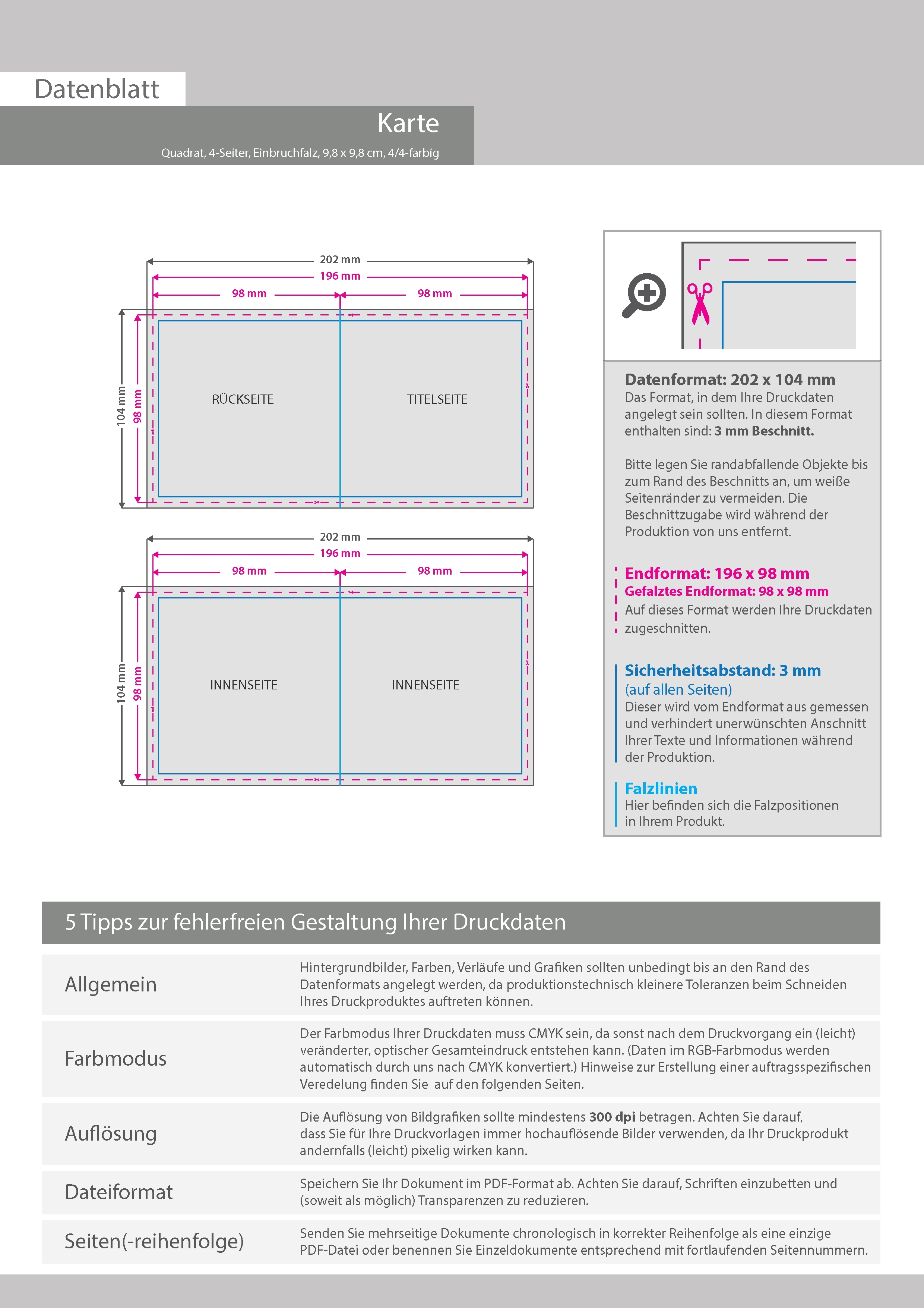 Einladungskarte, gefalzt auf Quadrat 9,8 cm x 9,8 cm, vertikaler Mittelfalz, 4-seitig