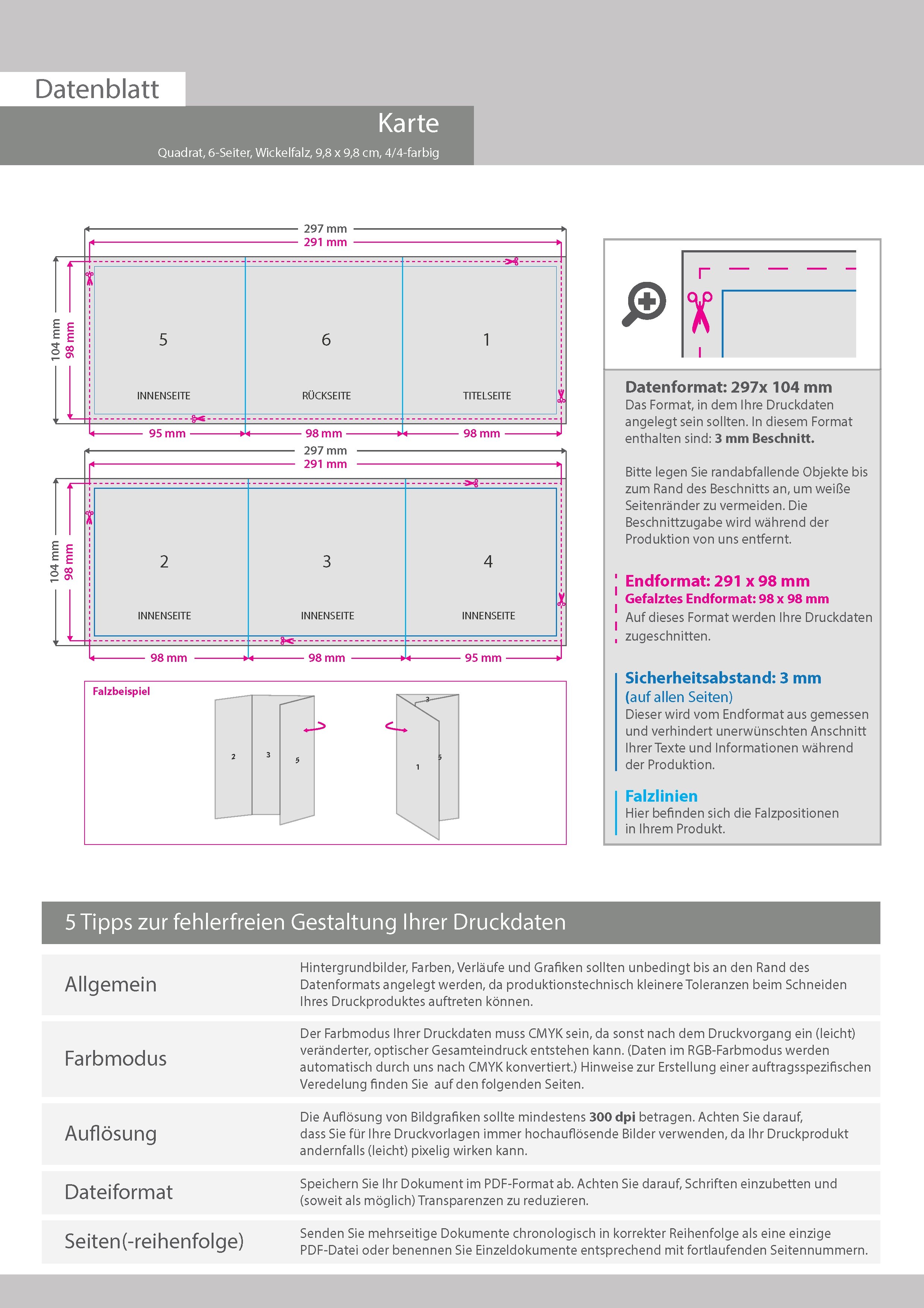 Einladungskarte, gefalzt auf Quadrat 9,8 cm x 9,8 cm, vertikaler Wickelfalz, 6-seitig