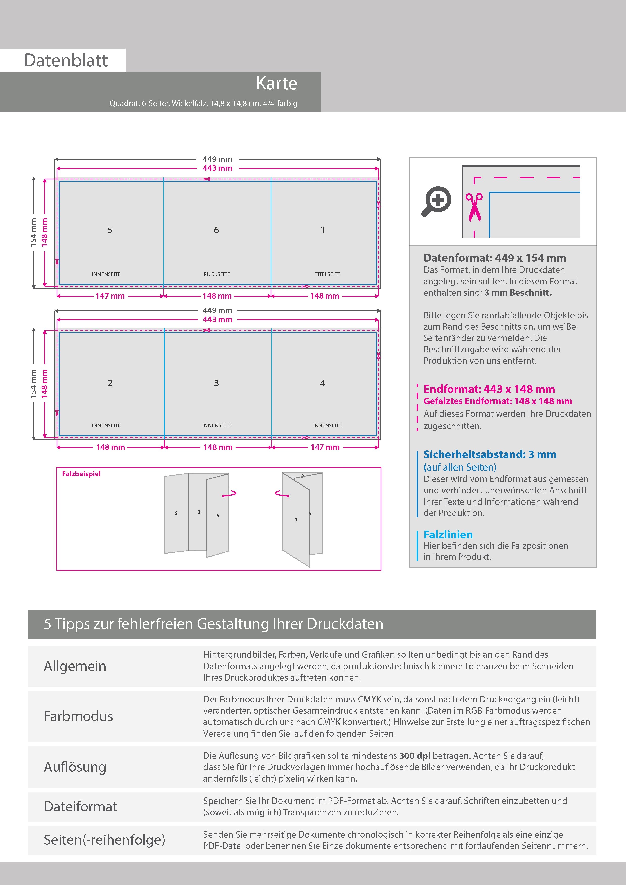 Einladungskarte, gefalzt auf Quadrat 14,8 cm x 14,8 cm, vertikaler Wickelfalz, 6-seitig