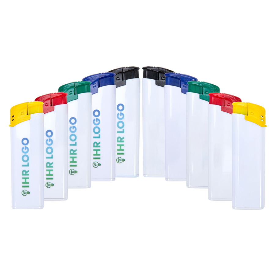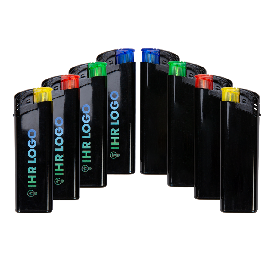 In unserem Shop finden Sie unterschiedliche Modelle in vielen wunderschönen Farben. Entscheiden Sie sich einfach für die Variante, die am besten zu Ihrem Unternehmen oder dem gewünschten Motiv passt! Unsere Elektro-Feuerzeuge bestehen aus robustem Kunststoff und sind alle nachfüllbar. Selbstverständlich erfüllen sie außerdem den Sicherheitsstandard für Feuerzeuge und sind überdies kindergesichert. Wir tragen Ihr 4-farbiges, individuelles Design abhängig von Ihren Wünschen mittels UV-Druck auf einer oder beiden Seiten auf. Die hierfür zur Verfügung stehende Fläche hängt vom jeweiligen Feuerzeugmodell ab.